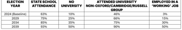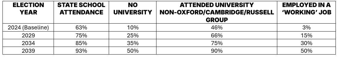 Candidate selections should follow a ‘balanced ticket’ rule whereby one candidate that attended a private school or Oxbridge/Russell Group university should be paired with another who attended a state school or did not go to university in a neighbouring constituency. Tax returns and asset disclosures should be provided pre-selection to election auditors to monitor this.